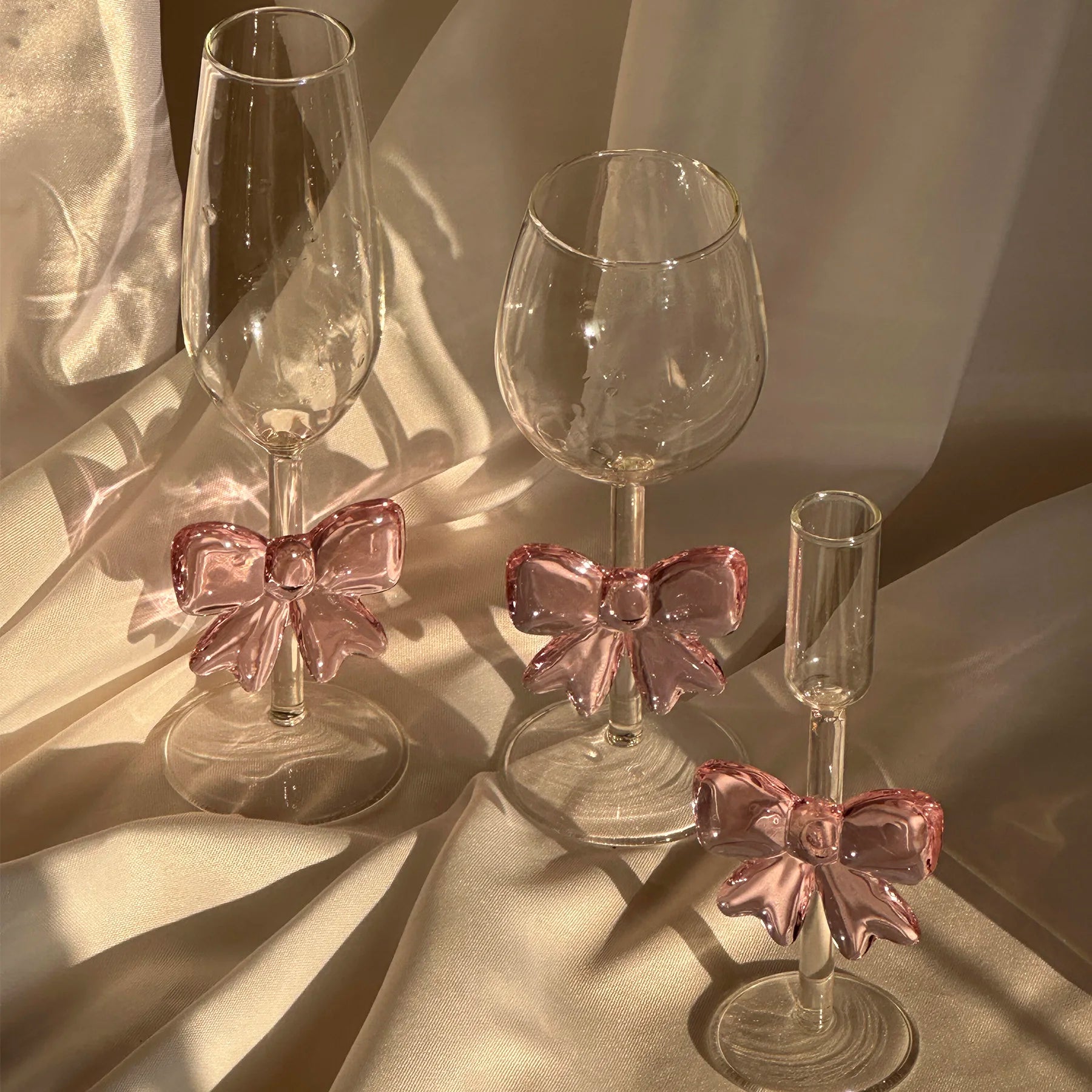 Turn any drink into a celebration. These elegant glasses with pink bow accents are perfect for toasting or displaying. Heat-resistant and beautifully refined.